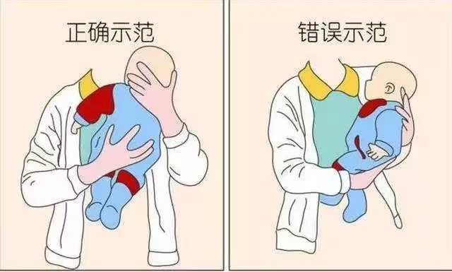 注意:千萬(wàn)不能采用豎抱的方式,因?yàn)檫@個(gè)時(shí)候,寶寶的脊椎還無(wú)法支撐起寶寶的身體和頭部。容易讓寶寶受傷。